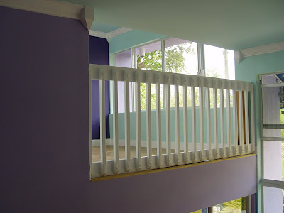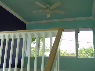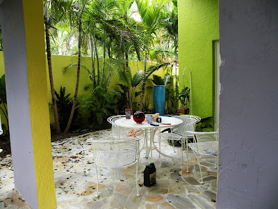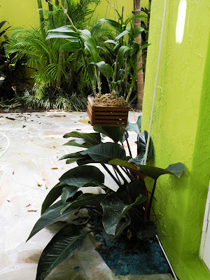 View looking left, the angel trumpet tree is just to the left of the big tree. The blue thing are windchimes that sound like church bells - i will eventually suspend them in the middle of the tree (it has a hollow spot). I love them windchimes. The stairs lead to a balcony overlooking the street and garden.