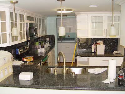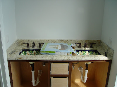 this is the master bathroom sink area - they installed the sinks incorrectly - they are supposed to rest on top of the granite - boo!